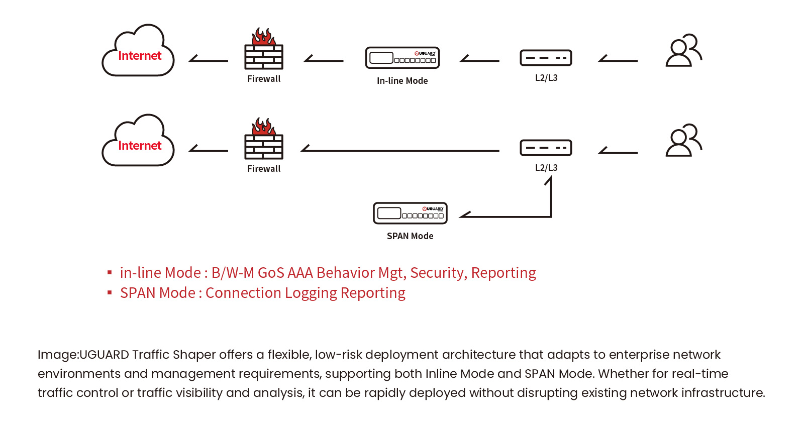In terms of deployment, Traffic Shaper supports both Inline and SPAN modes, allowing flexible integration into existing network architectures. It also offers hardware-based and software-based bypass designs to ensure uninterrupted operations, helping enterprises build a more resilient and comprehensive network usage management framework.