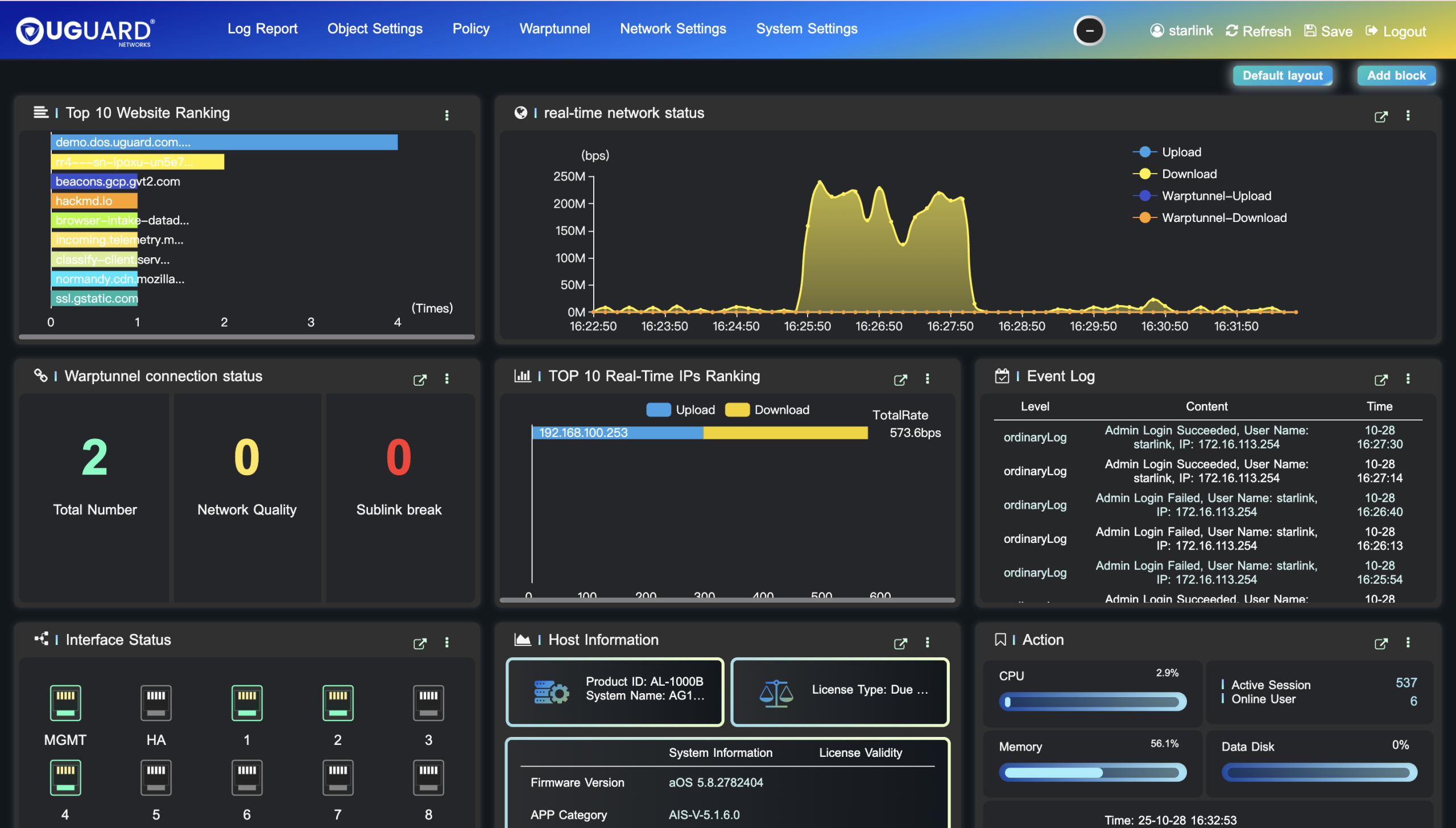UI Interface: “AgileLink Next-Generation WAN Management” provides key real-time insights, allowing administrators to quickly monitor device, system, and network status at a glance.
